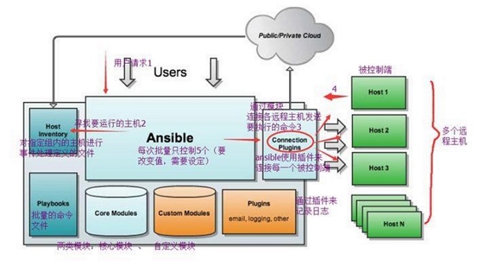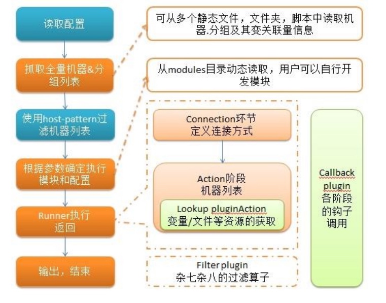 简单理解就是Ansible在运行时, 首先读取ansible.cfg中的配置, 根据规则获取Inventory中的管理主机列表, 并行的在这些主机中执行配置的任务, 最后等待执行返回的结果。